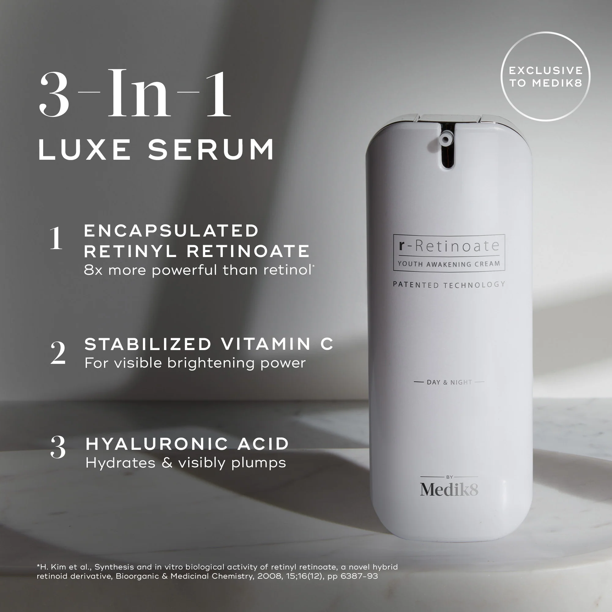 The multi-step-in-one formula combines retinyl retinoate with stabilized vitamin C and hyaluronic acid for profound visible improvement in skin tone, texture and radiance. r-Retinoate™ Day & Night interlaces revolutionary science with a sublime sensorial experience that's highly tolerated by the most sensitive skin.
